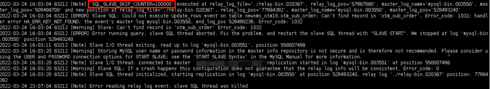 stop slave; start slave; show global variables like 'sql_slave_skip_counter'\G *************************** 1. row *************************** Variable_name: sql_slave_skip_counter Value: 0