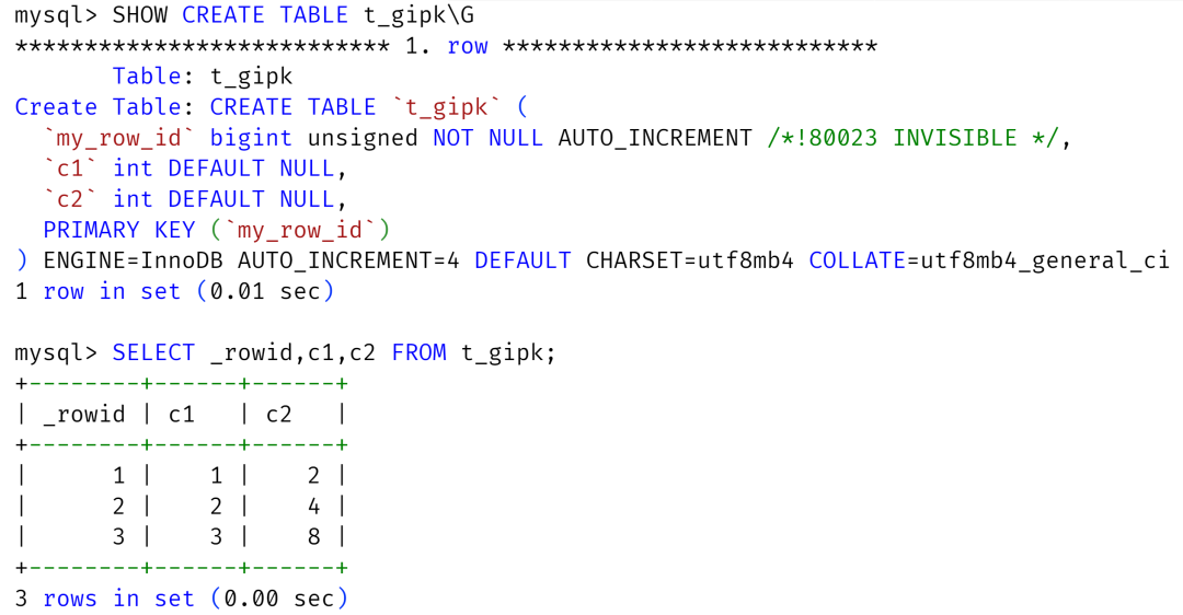 不得不说,官方 GIPK 的设计真的很优雅,不但解决了 InnoDB 引擎创建隐式主键的问题,甚至是解决了所有存储引擎表的问题。而且满足如果用户希望读取 ROWID 列的话,可以通过隐藏列 my_row_id 或_rowid 标识来访问。如: