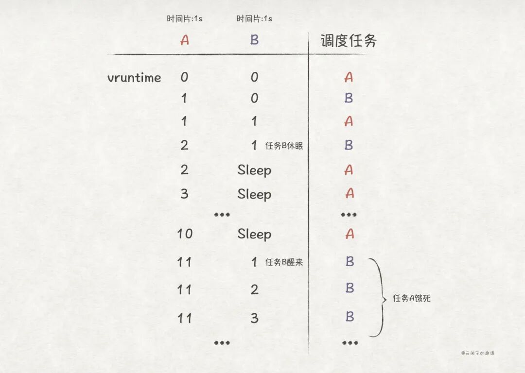 等 B 醒来后,就会比小 10s,在接下来的 10s 中,B 将会一直被调度,从而任务 A 出现了饿死现象。