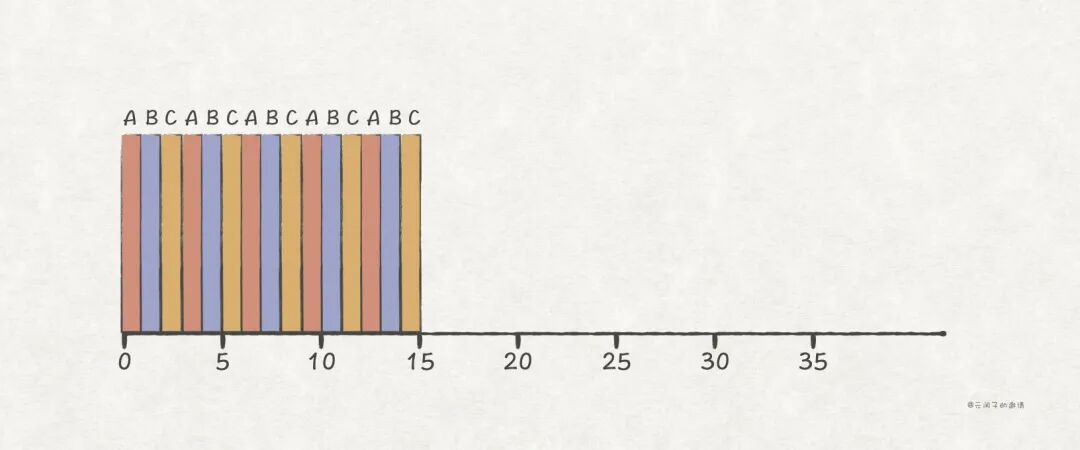 不妨假设 A、B、C 三个任务都在 t=0 时刻到达,运行时长都是 5s,那么这三个算法的调度情况如下,平均响应时长为 5s():
