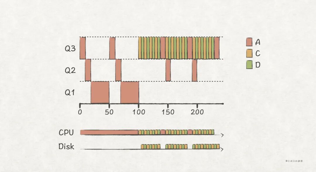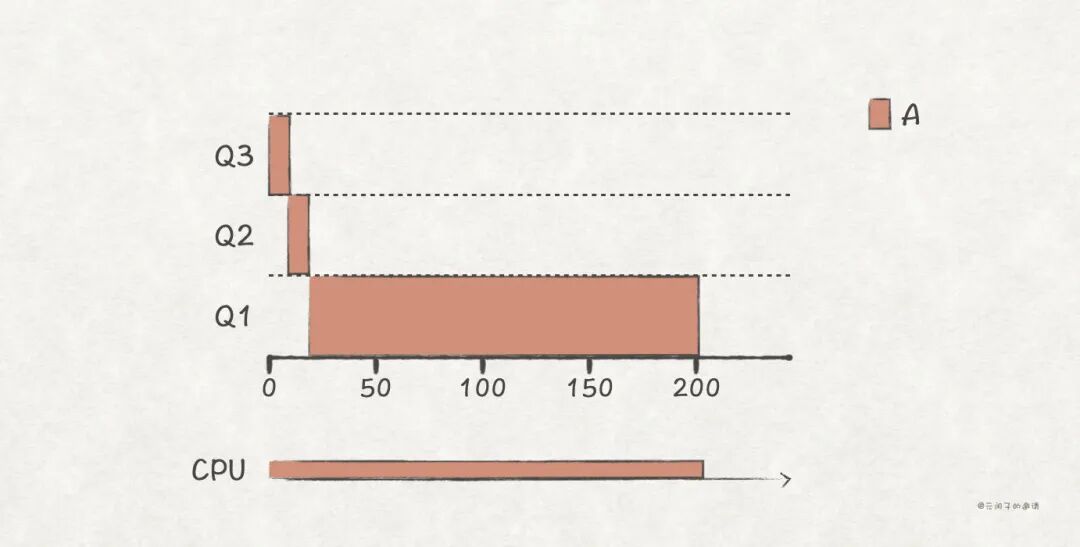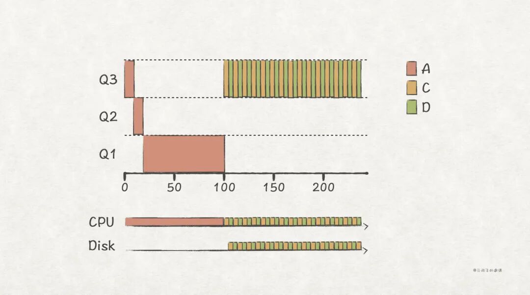 规则 4a:如果任务 A 运行了一个时间片都没有主动让出 CPU(比如 I/O 操作),则优先级降低一级