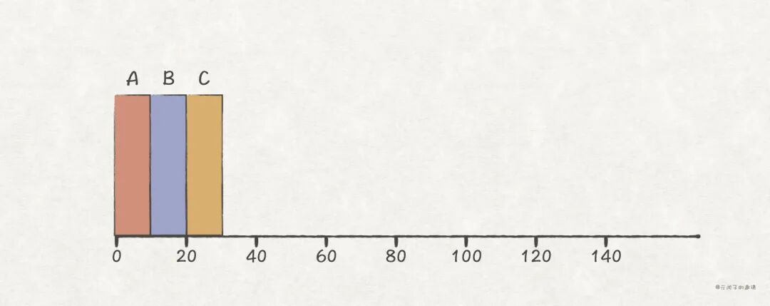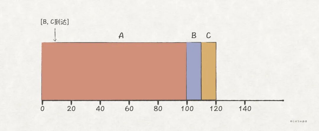 让我们继续打破假设 2,A 在 t=0 时刻,B 和 C 则在 t=10 时刻到达,那么调度情况会变成这样: