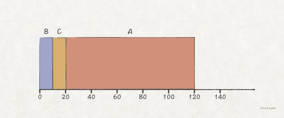 然而现实总是残酷的,如果假设 1 被打破,比如 A 的运行时间变成 100s,B 和 C 的还是 10s,那么调度情况是这样的:
