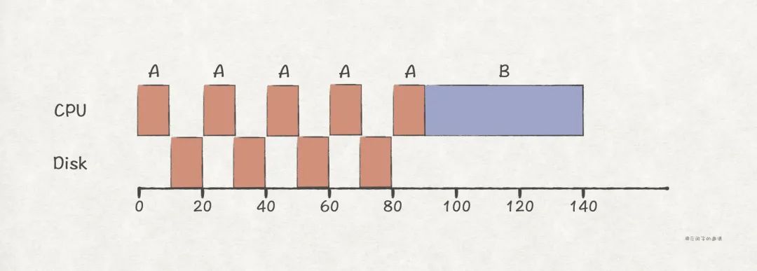 现在让我们打破假设 4,考虑任务 A 和 B 都在 t=0 时刻到达,运行时长都是 50ms,但 A 每隔 10ms 执行一次阻塞 10ms 的 I/O 操作,而 B 没有 I/O。