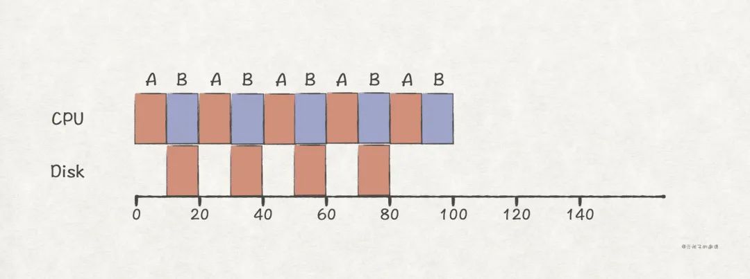 要解决该问题,只需使用 RR 的调度算法,给任务 A 和 B 分配 10ms 的时间片,这样当 A 阻塞在 I/O 操作时,就可以调度 B,而 B 用完时间片后,恰好 A 也从 I/O 阻塞中返回,以此类推,调度总时长优化至 100ms。