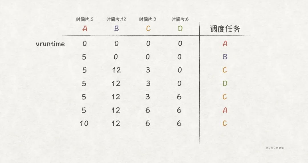 比如,当任务 A 运行了 5ms 的时间片之后,则更新为vruntime += 5ms