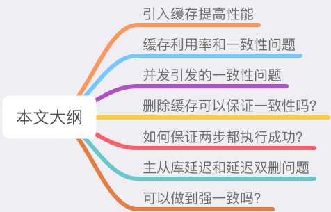 6、在「先更新数据库,再删除缓存」方案下,「读写分离 + 主从库延迟」也会导致缓存和数据库不一致,缓解此问题的方案是「延迟双删」,凭借经验发送「延迟消息」到队列中,延迟删除缓存,同时也要控制主从库延迟,尽可能降低不一致发生的概率