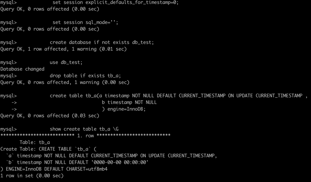 因为 explicit_defaults_for_timestamp 值为 0,且 b 字段不是第⼀个 timestamp 字段,没有显示声明 NULL 属性或 DEFAULT 属性,所以会赋予默认值 ‘0000-00-00 00:00:00’。