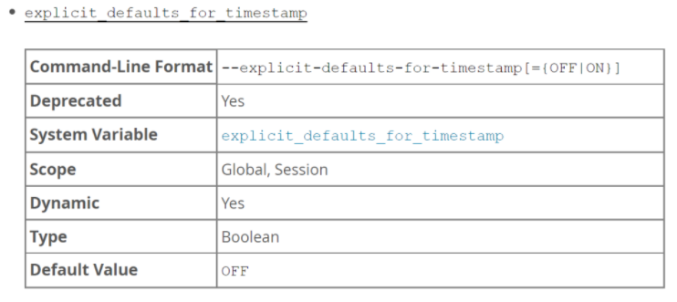 《故障分析 | MySQL 迁移后 timestamp 列 cannot be null》这篇文章其实介绍过,MySQL 中有个 explicit_defaults_for_timestamp 变量,他决定了 MySQL 是否为 TIMESTAMP 列的默认值和 NULL 值的处理启用某些非标准的行为:
