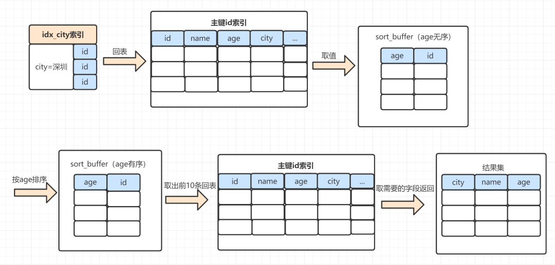 中,将所有数据根据 age 进行排序; - 按照排序结果取前 10 行返回给客户端。