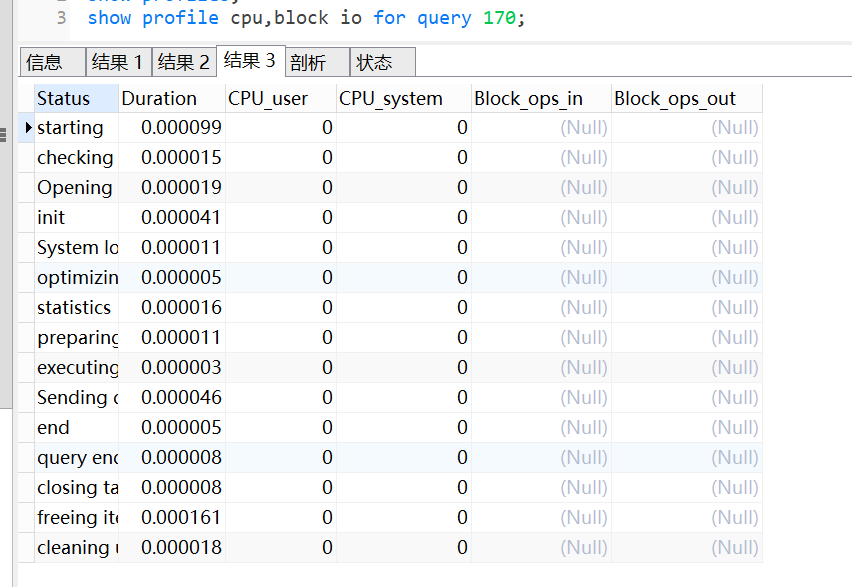 查看最近一条 SQL 的分析,也可以使用show profile for query id