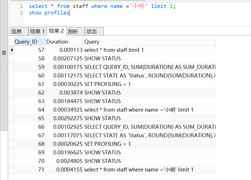 定义,默认是 15。如果我们需要看单独某条 SQL 的分析,可以show profile