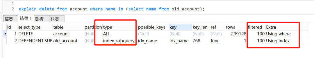 可以发现,实际执行的时候,MySQL 对 select in 子查询做了优化,把子查询改成 join 的方式,所以可以走索引。但是很遗憾,对于delete in