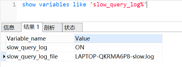 查看下慢查询日志配置,我们可以使用show variables like 'slow_query_log%'