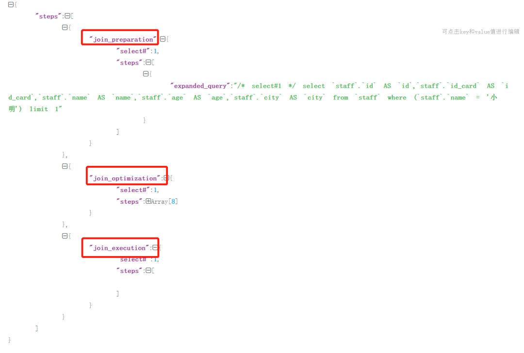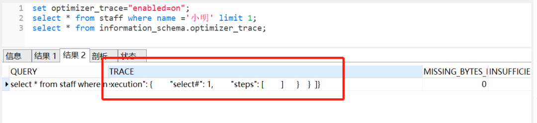 打开开关,接着执行要跟踪的 SQL,最后执行select * from information_schema.optimizer_trace
