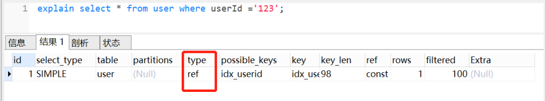 类型的一个特例,一般情况下是不会出现的。 - const:通过一次索引就能找到数据,一般用于主键或唯一索引作为条件,这类扫描效率极高,,速度非常快。